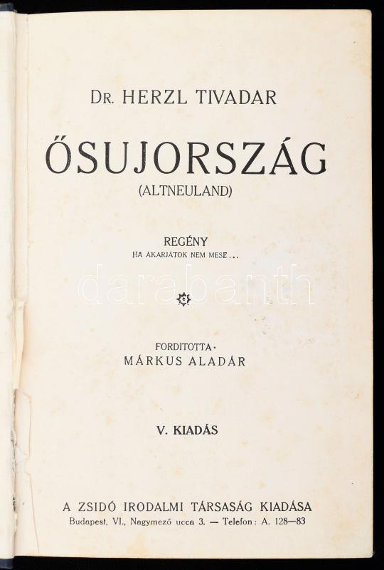 Herzl Tivadar: Ősujország. (Altneuland.) Regény. Ford.: Márkus Aladár.... https://www.darabanth.com/en/498-Online-auction/498.0/Books/Books-Judaica~2000134/Herzl-Tivadar-Osujorszag-Altneuland-Regeny-Ford-Markus-Aladar-Bp-1929-Zsido-Irod~II3401026