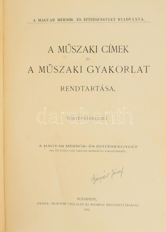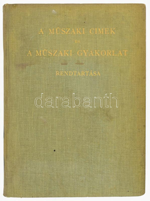 A műszaki cÃmek és a műszaki gyakorlat rendtartása. Törvénytervezet. Melléklet: A műszaki cÃmek és a műszaki gyakorlat rendtartásához. IsmertetÅ‘ beszédek. Bp., 1900, Magyar Mérnök- és ÉpÃtész-Egylet, ("Pátria"-ny.), IX+216+23 p. Korabeli aranyozott egészvászon-kötés, festett lapélekkel, kopott, foltos borÃtóval.
