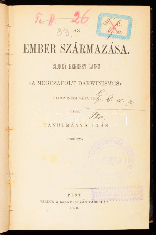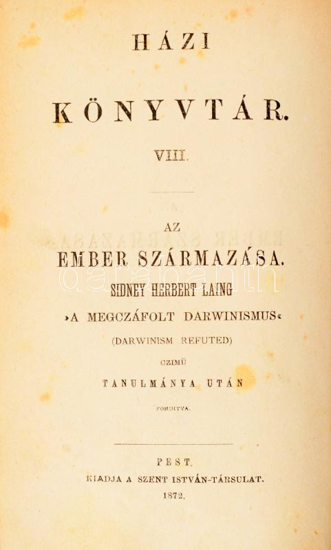 Description: Az ember származása. Sidney Herbert Laing "A megczáfolt darwinismus" czímű tanulmánya után fordítva. Pest, 1872, Szent István-Társulat. + Hasznos és kártékony állatainkról kézikönyv. Bp., 1874, Szent István-Társulat. Félvászon kötés, kopottas állapotban.