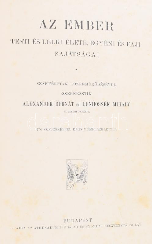 Az ember testi és lelki élete, egyéni és faji sajátságai. Szerk.: Alexander Bernát és Lenhossék Mihály. A Műveltség Könyvtára. Bp., 1905, Athenaeum, 5 sztl. lev.+ 781+(1) p.+ 39 t. Szövegközti és egészoldalas, fekete-fehér és színes illusztrációkkal. Kiadói szecessziós, aranyozott félbőr-kötés, viseltes, sérült borítóval és gerinccel, helyenként kissé sérült, foltos lapokkal.