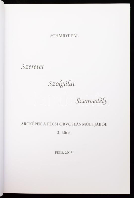 Schmidt Pál: Szeretet, szolgálat, szenvedély. Arcképek a pécsi orvoslás múltjából. 2. kötet. Pécs, 2015, Pécsi Tudományegyetem Általános Orvostudományi Kar. Kiadói kartonált kötés, jó állapotban.