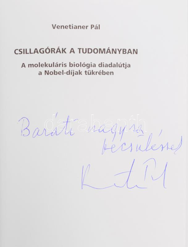 Venetianer Pál: Csillagórák a tudományban. A molekuláris biológia diadalútja a Nobel-díjak tükrében. A szerző, Venetianer Pál (1935-) biológus, biokémikus, kutatóprofesszor által DEDIKÁLT példány. Bp., 2003, Medicina, 319 p. Kiadói kartonált papírkötés.