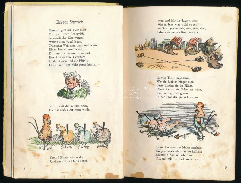 Description: Busch, Wilhelm: Max und Moritz. Eine Bubengeschichte in sieben Streichen. München, 1968, k.n. Reprint kiadás. Színes illusztrációkkal. Német nyelven. Kiadói félvászon-kötés, kissé viseltes borítóval, részben foltos lapokkal.