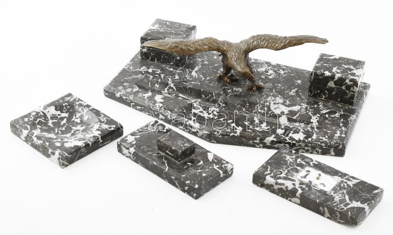 Description: Márvány íróasztali készlet bronz sas szoborral. Tintatartóval (betét nélkül), tolltartóval két tapperrel (egyik teteje hiányzik), egy hamutállal. Nagy mérete 35x24 cm