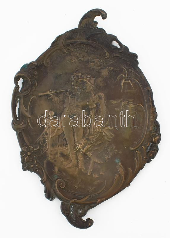 Szecessziós bronz névjegykártyatartó, belsejében kastély életkép jelenettel, 21x15 cm