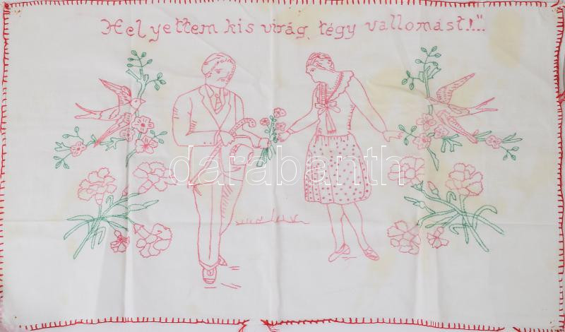 Kézzel hímzett konyhai falvédő, "Helyettem kis virág tégy vallomást" felirattal, 44x77 cm