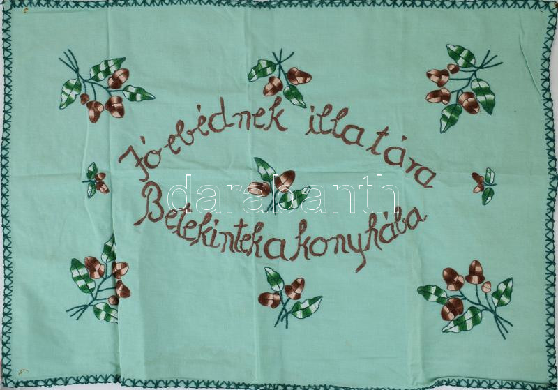Kézzel hímzett konyhai falvédő, "Jó ebédnek illatára Betekintek a konyhába" felirattal, 49x69 cm