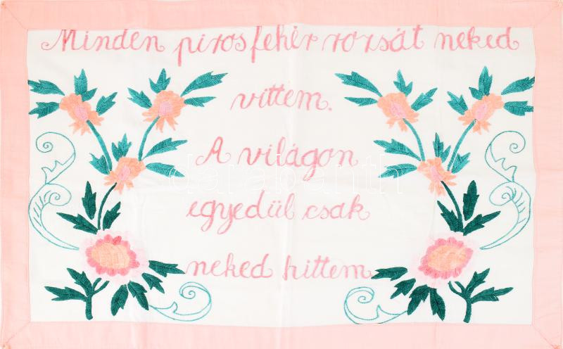 Kézzel hímzett konyhai falvédő, "Minden piros fehér rózsát neked vittem. A világon egyedül csak neked hittem" felirattal, 51x77 cm