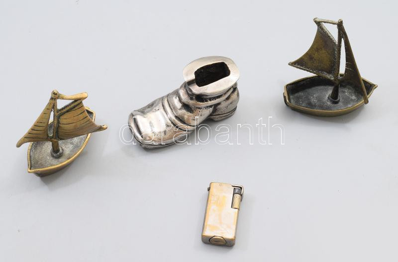 4 darab dohányzással kapcsolatos tárgy: Mofém öngyújtó, ezüstözött bronz öngyújtótartó, 2 darab hajó alakú hamuzó, m: 10 cm alatt