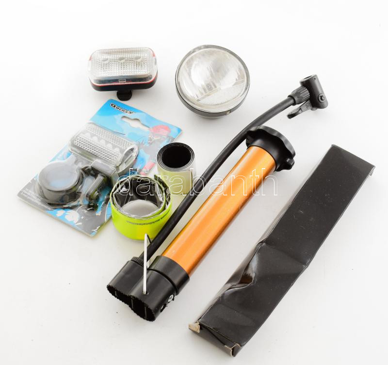 7 darabos kerékpár kiegészítőt tétel, fényszóró, villogó, fényvisszaverő, stb.