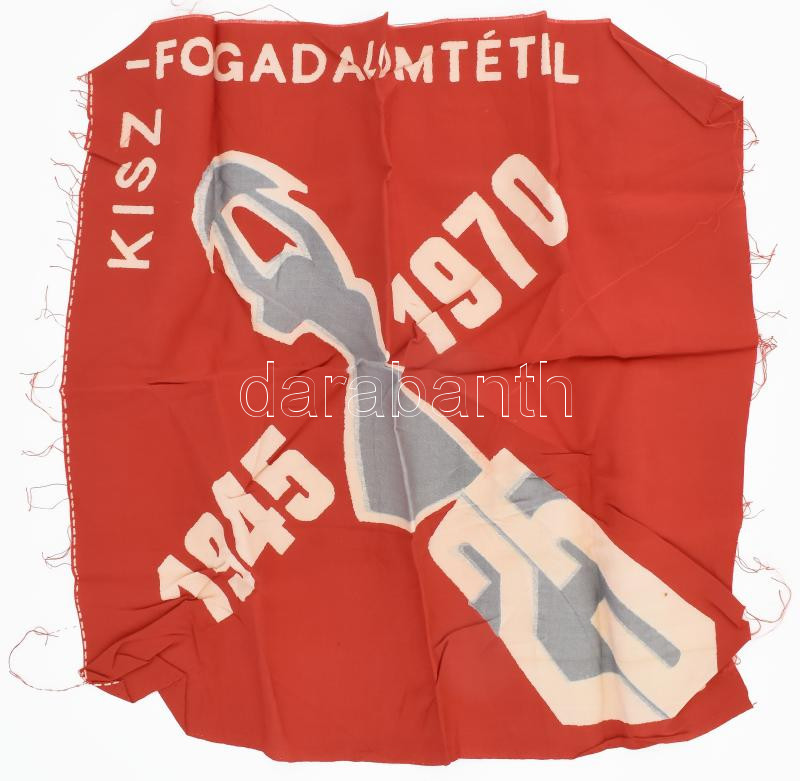 KISZ fogadalomtétel 1945-1970 emlékkendő Szabadság-szobor ábrázolással, kissé foszlott, gyűrött, kb. 43x43 cm
