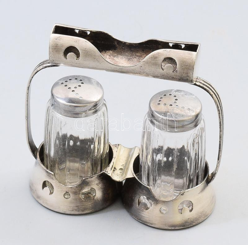 Régi ezüstözött sóborskínáló, fogpiszkatartó résszel, jelzett, kopással, m: 12 cm