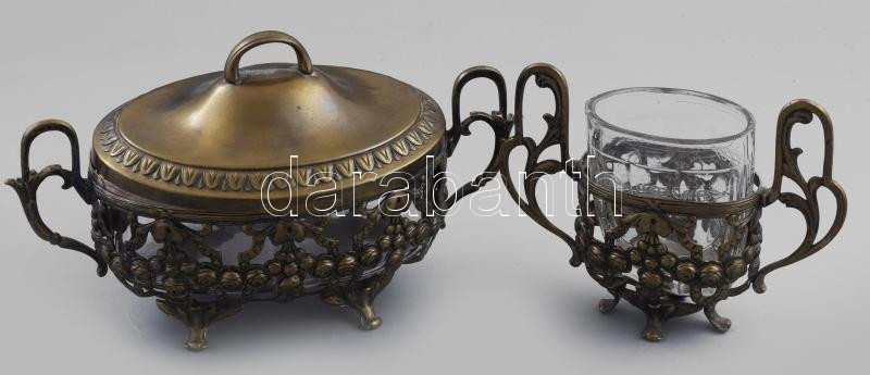 Szecessziós alpakka kínáló és kúrapohár, előbbi nem beleillő üvegbetéttel, fedéllel, 24x14 cm, m: 12,5 cm