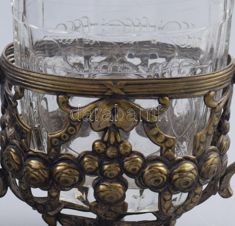 Szecessziós alpakka kínáló és kúrapohár, előbbi nem beleillő üvegbetét...