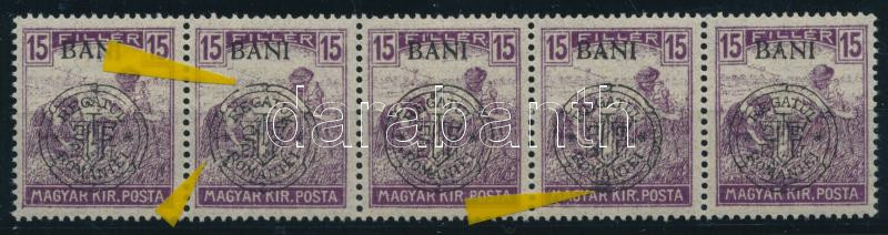 Kolozsvár 1919 Arató 15f 5-ös csík, benne "hurkás kör és kihasadt kör" lemezhiba, Bodor vizsgálójellel