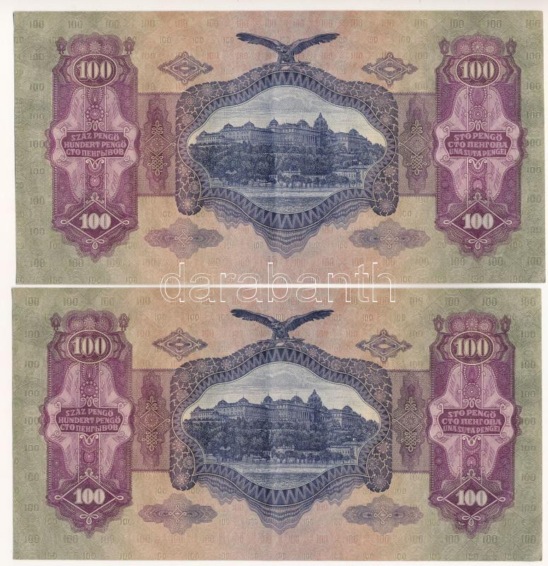 https://www.darabanth.com/en/498-Online-auction/498.0/Numismatics/Hungarian-Banknotes~1000097/1930-100P-2x-sorszamkovetok-E-328-065597-E-328-065598-TXF-VF-hullamos-papir3Cbr-3E-Ada~II3345483