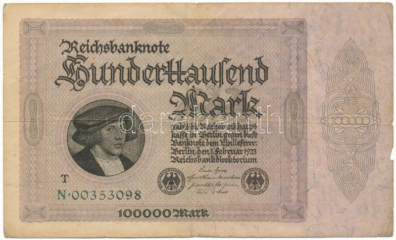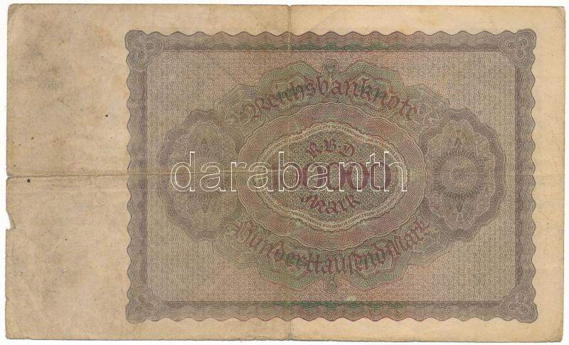 Német Birodalom 1923. 100.000M T:F, kereszthajtásnál pici lyuk, tűlyuk... https://www.darabanth.com/en/498-Online-auction/498.0/Numismatics/Worldwide-banknotes~1000103/Nemet-Birodalom-1923-100000M-TF-kereszthajtasnal-pici-lyuk-tulyuk3Cbr-3E-German-Empire-1923~II3277897