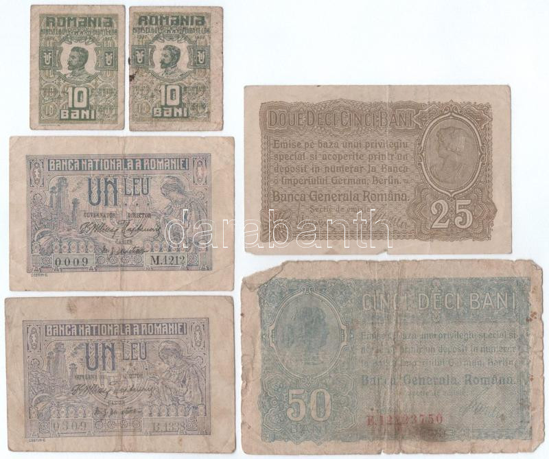 Romania / Mixed 6pcs of banknotes lot, including: 1917. 10 Bani "Ministry of Finance" (2x), German occupation 1917. 25 Bani + 50 Bani; 1920. 1 Leu (2x) C:F,VG