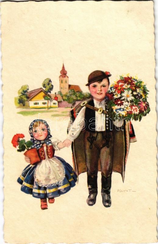 1932 Children in traditional costumes, Hungarian folklore art postcard. Magyar Rotophot 900/4. s: Pólya T.