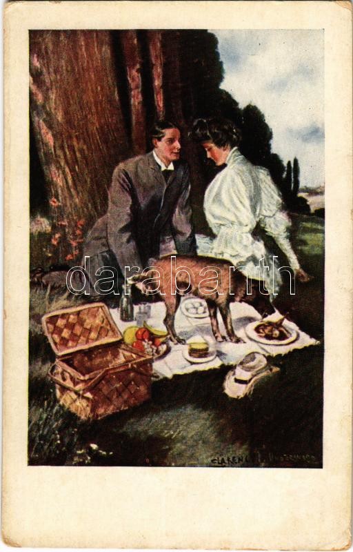 Romantic couple having a picnic, lady, dog. M. Munk Vienne 389. s: Clarence F. Underwood (EK)