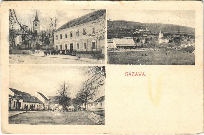 1908 Sázava, Sasau; street view, square, church, shop. Fotogr. A. Pokorny (small tear)