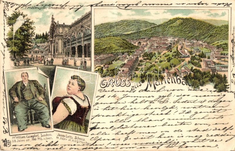 Marianske Lazne, Marienbad; Kreuzbrunnen-Promenade / town-view, promenade, world's heaviest man and woman, litho (fa)