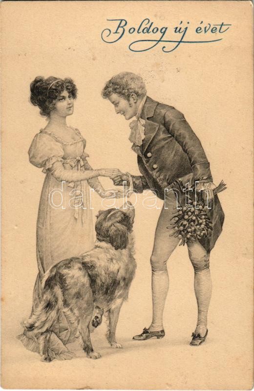 1909 Boldog Újévet! / New Year greeting card, romantic couple with dog. Déposé Serie 179.