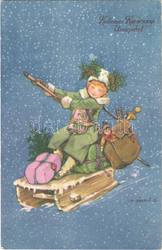 1936 Kellemes Karácsonyi Ünnepeket / Christmas greeting art postcard, sled with toys s: K. Sávely D.