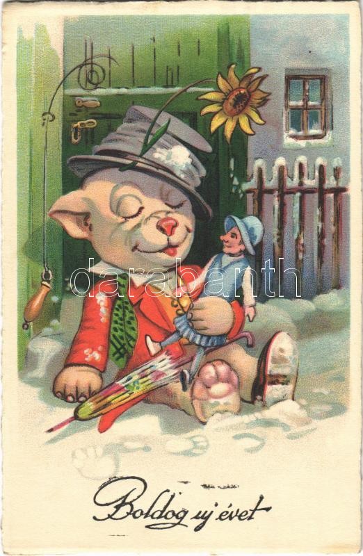 Boldog Újévet! / New Year greeting art postcard with Bonzo dog. ERIKA Nr. 5021. (EK)