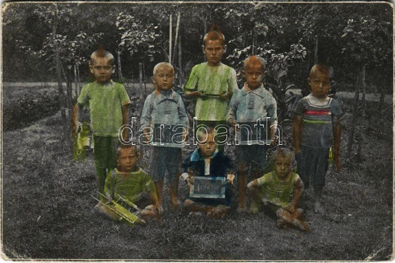 Description: 1923 Budapest XVIII. Pestszentlőrinc, Pusztaszentlőrinc, Szentlőrinc; A Szent József és Szent Lőrinc Otthon árvái adománygyűjtő lapja, "Isten fizesse meg" (kopott sarkak / worn corners)