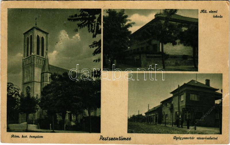 Budapest XVIII. Pestszentimre, Római katolikus templom, Gyógyszertár, Állami elemi iskola (vágott / cut)