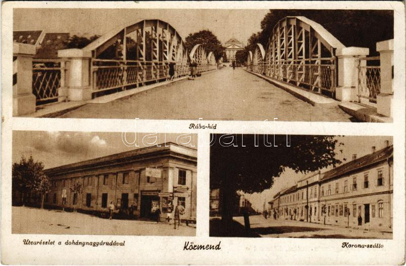 Körmend, Rába híd, utca, dohány nagyáruda üzlete, Korona szálloda és é...