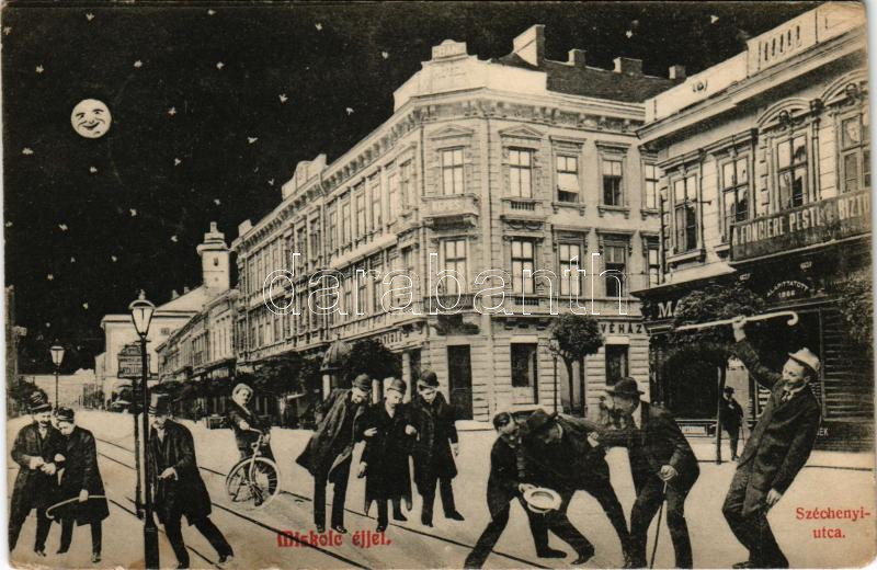 Description: Miskolc, Széchenyi utca éjjel, Kepes nagy szálloda és kávéház, Fonciere pesti biztosító, villamos megálló. Montázs részeg férfiakkal, Grünwald Ignác kiadása (EK)
