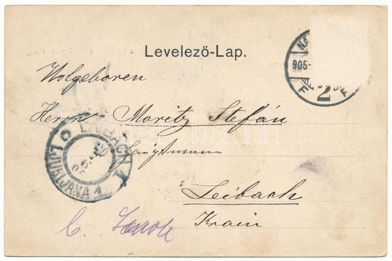 Description: 1905 Magyarcséke, Ceica; Római katolikus templom, Ritter H. üzlete és gyógyszertár télen. Szecessziós-virágos keret / Catholic church, shop, pharmacy in winter. Art Nouveau, floral frame (Rb)