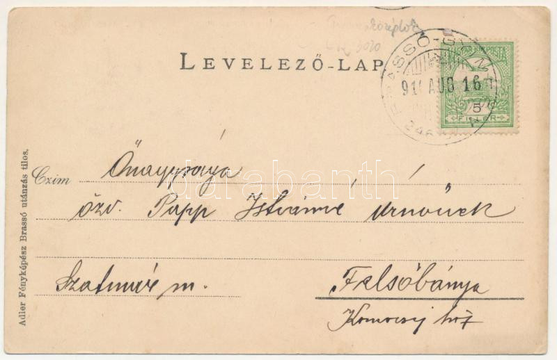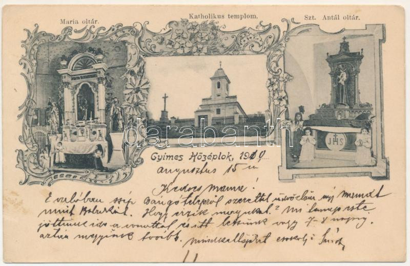 1910 Gyimesközéplok, Középlok, Lunca de Jos; Mária oltár, Katolikus templom, Szent Antal oltár. Adler fényképész, szecessziós-virágos keret / Catholic church, altars, interiors. Art Nouveau, floral frame + "BRASSÓ - GYIMES 246. SZ. A" vasúti mozgóposta bélyegző (EK)