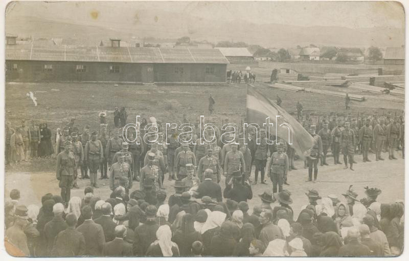 Description: 1917 Ditró, Gyergyóditró, Ditrau; IV. Károly király látogatása a cs. és kir. 69. gyalogezrednél, katonai szemle az Aradi fűrészgyár faragott fa raktáránál / WWI Austro-Hungarian military, Charles I of Austria visiting the soldiers. photo (EM)
