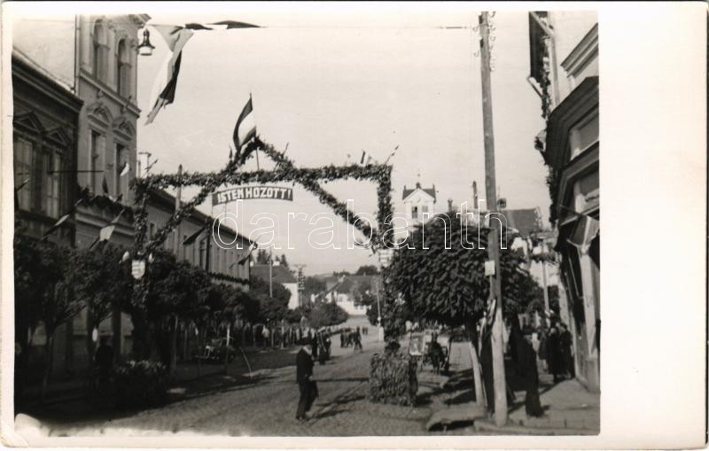 1940 Marosvásárhely, Targu Mures; bevonulás, feldíszített magyar címer... https://www.darabanth.com/en/498-Online-auction/498.0/Postcards/Transylvania~3000006/1940-Marosvasarhely-Targu-Mures-bevonulas-feldiszitett-magyar-cimeres-es-zaszlos-kapu-~II3400370