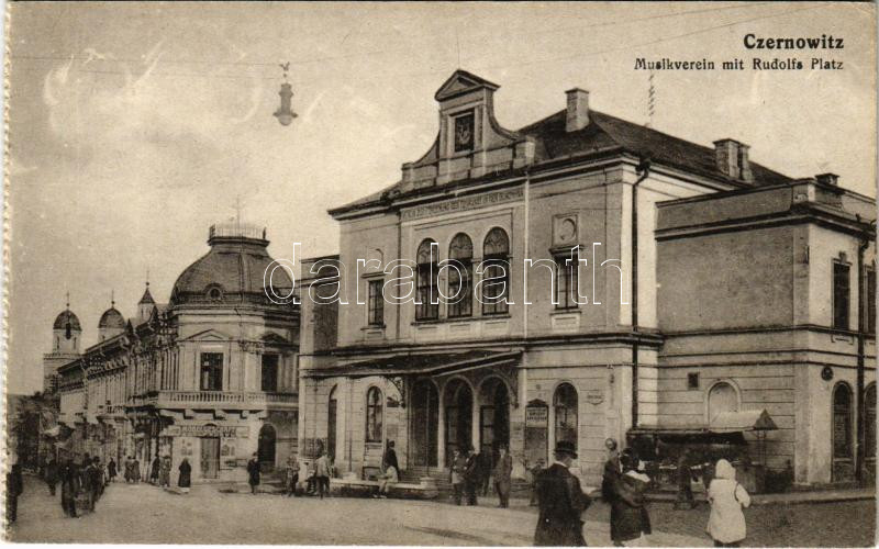 Description: Chernivtsi, Czernowitz, Cernauti, Csernyivci (Bukovina, Bucovina, Bukowina); Musikverein mit Rudolfs Platz / square, music club, shop. Verlag Moritz Gottlieb