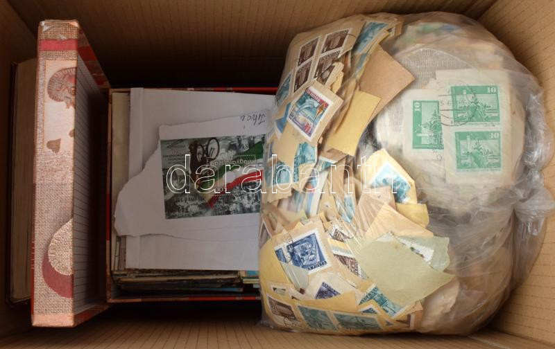 Description: Vegyes tétel, benne Magyar posta- és illetékbélyeg katalógus, nagy zacskónyi áztatnivaló, külföldi küldemények (főleg képeslapok), magyar bélyegek Abria berakóban