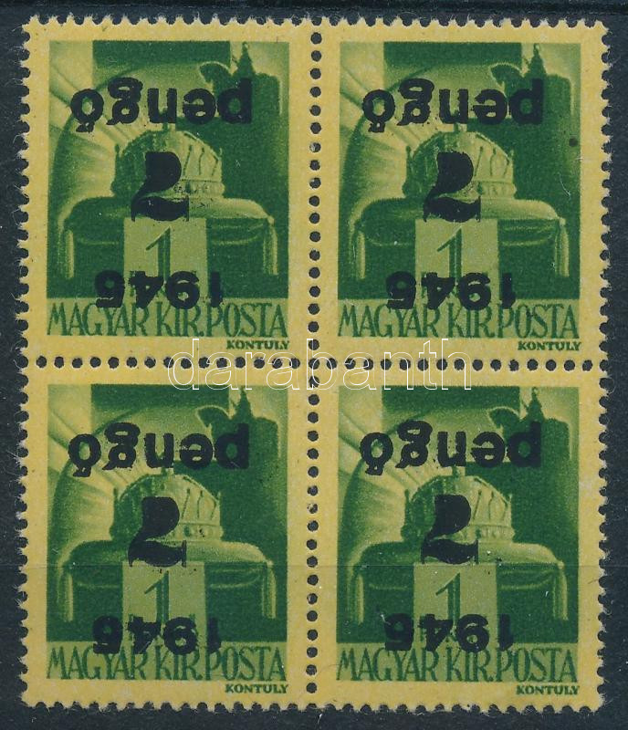 1945 Kisegítő bélyegek 7P/1P 4-es tömb fordított felülnyomással (120.0...