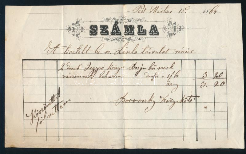 1864 Borovszky Samu pesti könyvkötő számlája kitöltve, hajtva, jó állapotban. Sk aláírva.