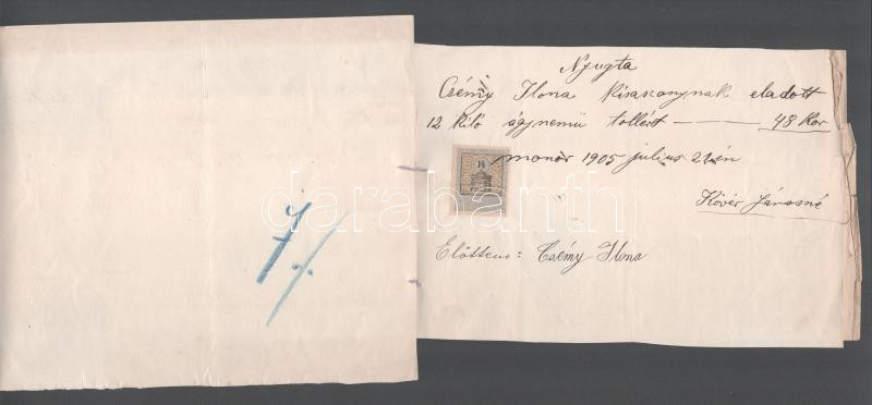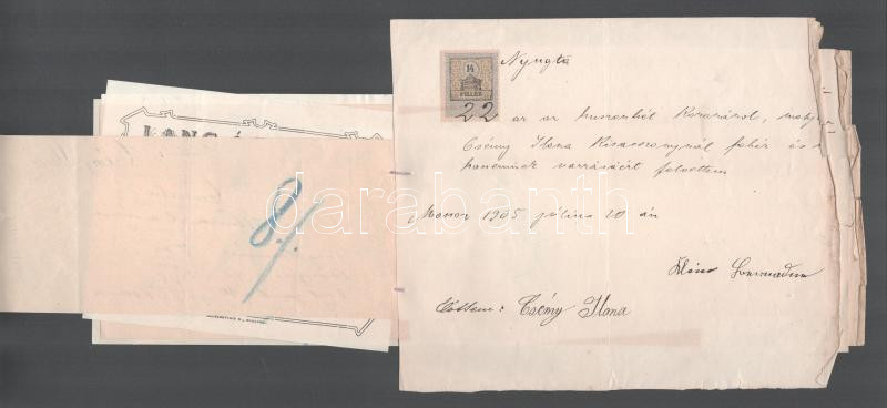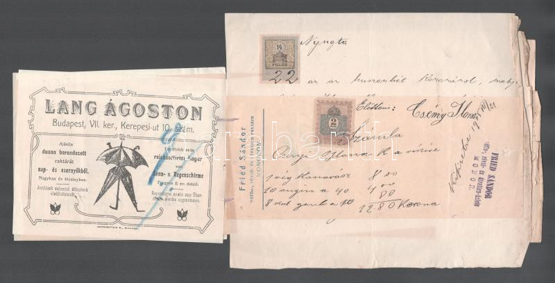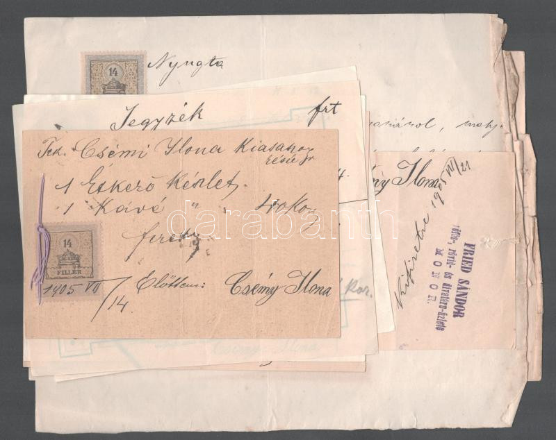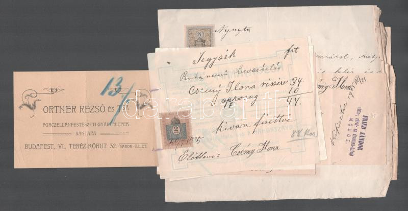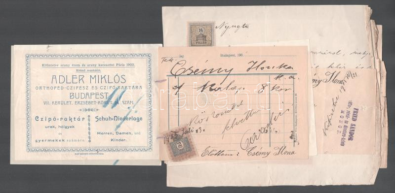 1905 9 db régi számla, szecessziós, judaika témájú is . Fried, Friedmann, Kosch cégek, elegáns és jómódú Csény Ilona esküvő előtti bevásárlásának számlái, étkező készlet, Ortner Rezső, ruhanemű - Kosch és Knapp, Cipő . Adler Miklós, Kalap . Mile Caroline, esernyő Láng Ágoston, ágynemű Fired Sádnor, fehérnemű varrás, ágynemű toll Kövér Jánosné, Monor, arany lánc és kereszt- Friedmann Izidor, 8 db számlán okmánybélyeg