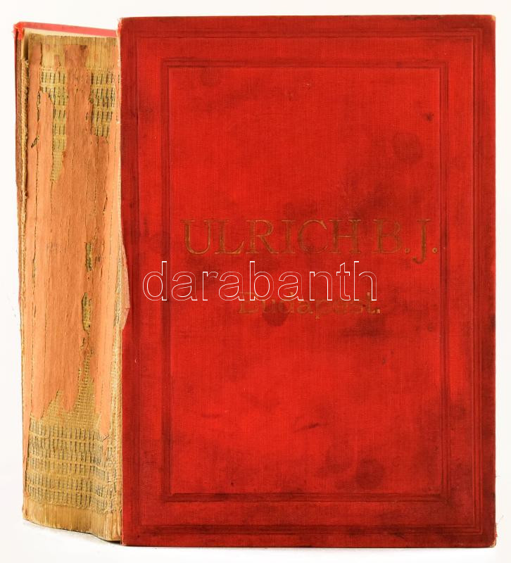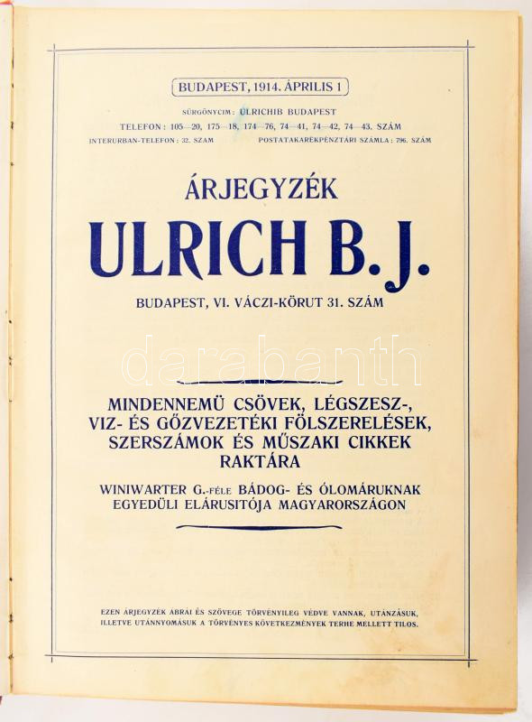 1914 Ulrich B. J. Árjegyzéke. Budapest, 1914. április 1. Mindennemű csövek, légszesz-, víz- és gőzvezetéki fölszerelések, szerszámok és műszaki cikkek raktára. Winiwarter G.-féle bádog- és ólomáruknak egyedüli elárusítója Magyarországon. Bp., Ulrich B.J., 1360 p. Magyar és német nyelven. Gazdag szövegközti képanyaggal illusztrált. Kiadói aranyozott egészvászon-kötésben, kopott, foltos borítóval, hiányzó gerinccel, néhány foltos lapszéllel, gyűrött szennylappal.