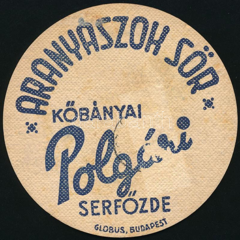 1918 Tapolca, "Aranyászok Sör" Kőbányai Polgári Serfőzde söralátét. Bu... https://www.darabanth.com/en/500-Online-auction/500.0/Art-and-other-collectibles/Advertisement~1000006/1918-Tapolca-Aranyaszok-Sor-Kobanyai-Polgari-Serfozde-soralatet-Budapest-Globus-ny-a~II3407483