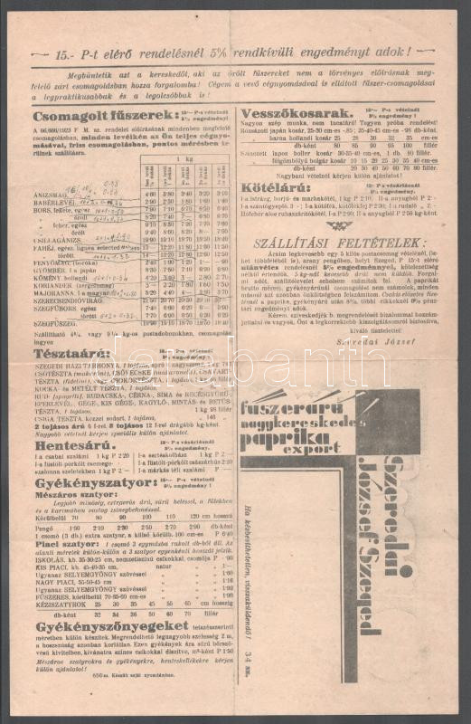 1934 Szeged, Szeredai József. Szegedi paprika export, 1934. okt. 4., reklám árjegyzék, nyomtatvány, 1 sztl. lev.