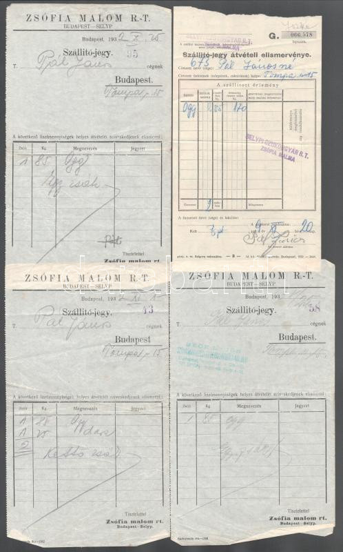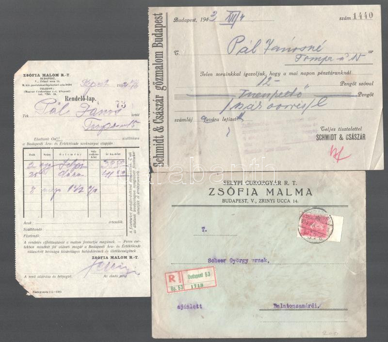 7 darab malomiparral, cukorgyártással kapcsolatos számla