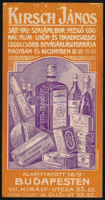 Budapest, Kirsch János sajt-, vaj-, szalámi, bor-, pezsgő-, cognac-, rum-, likőr és teakereskedés számolócédula, hátoldalán "Király" kávéház, az egyik sarkán gyűrűdéssel