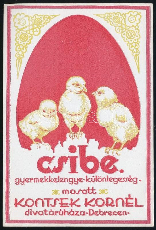 Csibe. Konstsek Kornél debreceni divatáruháza gyermekkelengye - különlegessége, reklámcímke.
