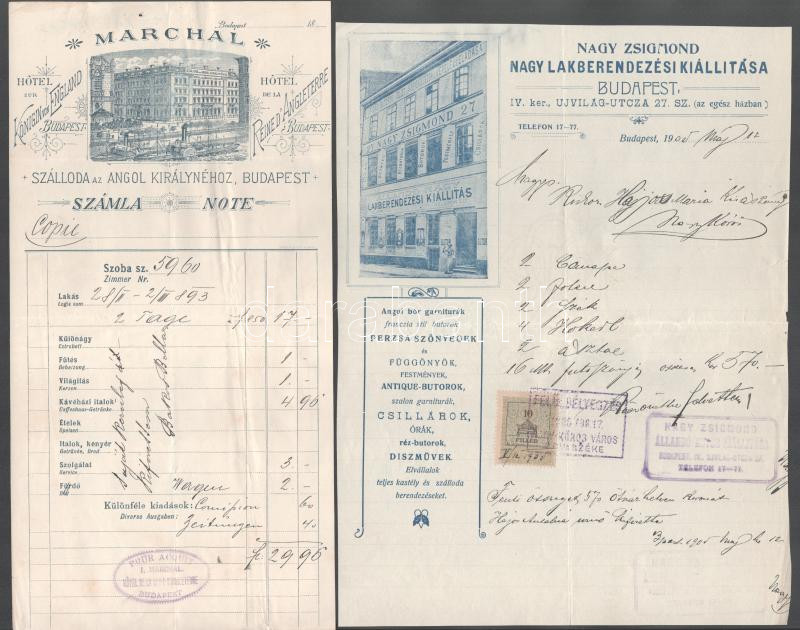 cca 1900 3 db dekoratív fejléces számla Nagy Zsigmond Lakberendezési kiállítása, Hirsch testvérek divat áruház, Marchal szálloda az Angol Királynéhoz