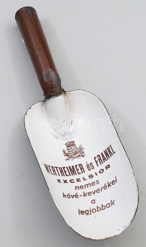 cca 1910 "Wertheimer és Frankl Excelsior nemes kávé-keverékei a legjobbak" feliratos zománcozott kávékimérő kanál, zománchibákkal, h: 24,5 cm